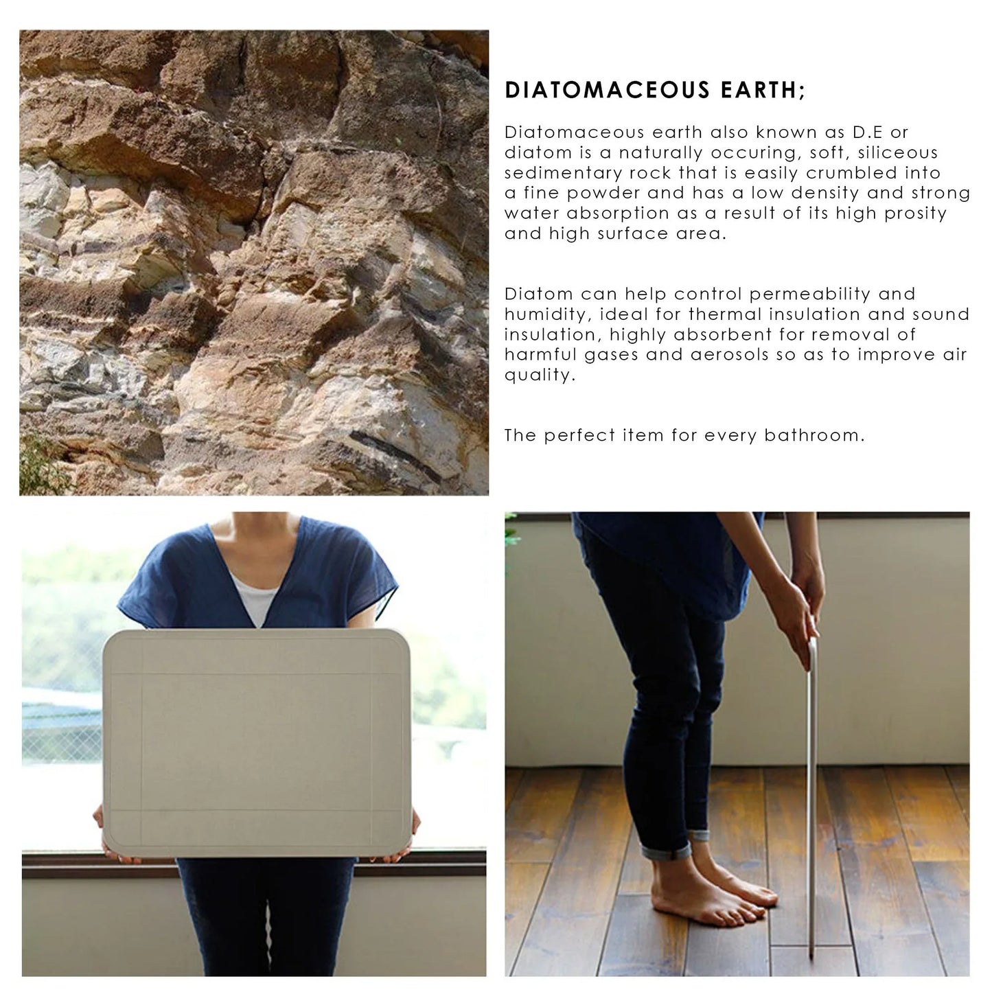 TOYO I-DRIED BATH MAT is made of ancient phytoplankton (diatoms) as raw materials which has functions as super absorbent - about 78%-80% water absorption antibacterial deodorant non-slip and so on. You won't have to worry about getting your floor wet after you come out of the bathroom . The water on your feet can quickly suck away . When your feet leave the bath mat the wet footprints will disappear within 15 seconds. The strong water absorption ability and Good anti-skid performance could become your a perfect bathroom partner. The Diatomaceous mat does not add any harmful substances and bleach natural green material of it effectively prevent the propagation of bacteria. It's the best choice for millions of families! It is so easy to take care of it when there is stains on the surface washing it by water and use sandpaper gently grinding the surface until removed then let it dry naturally the quickly renewing bath mats looks the same as the new one.